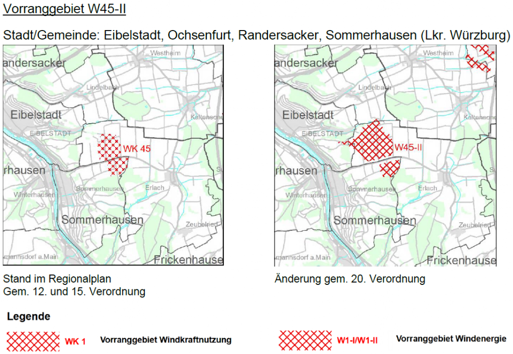 Der Regionale Planungsverband hat am 17.12.2025 die Fortschreibung des Regionalplans Windenergie beschlossen. Damit wird das bestehende Vorranggebiet in Erlach deutlich Richtung Eibelstadt und Sommerhausen ausgeweitet. Die Bedenken der Stadt Ochsenfurt führten zu keiner Änderung der Planung und wurden zur Kenntnis genommen. Genauere Informationen gibt es auf der Seite der Regierung von Unterfranken.