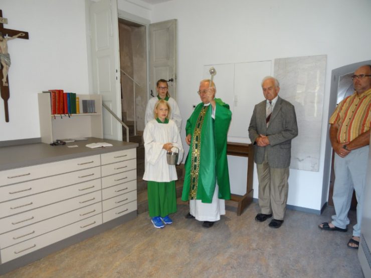 Sanierung der Sakristei der Schlosskapelle in Erlach abgeschlossen Erlach. Seit Ostern lief Sanierung der Sakristei der Schlosskapelle Erlach. Pfarrer Franz Schmitt freute sich Ende Juli 2017 über den Abschluss der Arbeiten und segnete nach dem Sonntagsgottesdienst den neu gestalteten Raum. Ausgangspunkt der Sanierung war die veraltete Elektroinstallation, die komplett erneuert werden musste. In diesem Zug […]