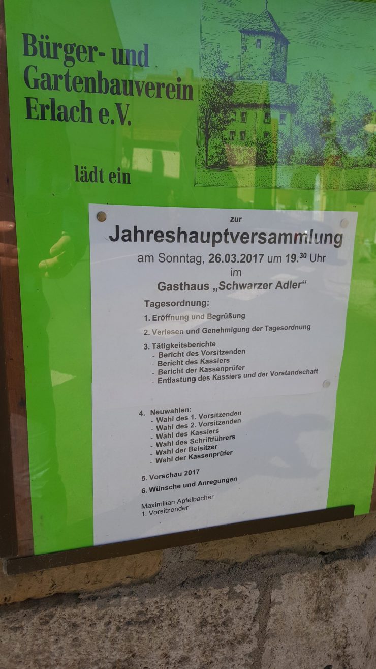 Im Jahr 2017 geplant ist ein Frühjahrsputz in der Erlacher Flur mit der Krabbelgruppe, das Maibaumaufstellen, eine Fahrt zum Baumwipfelpad, das Sommerfest im Schlossgraben, ein Dorfgespräch, der Bremserabend und zum Abschluss des Jahres ein Silvesterabend. Ortssprecher Tilo Hemmert dankte dem Vorstand und den Vereinsmitgliedern für ihren großartigen ehrenamtlichen Einsatz für Erlach. Zum Abschluss der Versammlung stellte er die neu gestaltete Homepage www.erlach-erleben.de vor, auf der viele Aktivitäten und Termine rund um das Dorfleben zu finden sind.