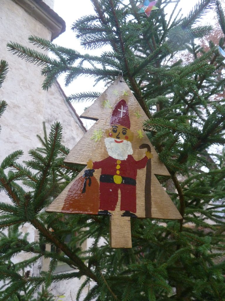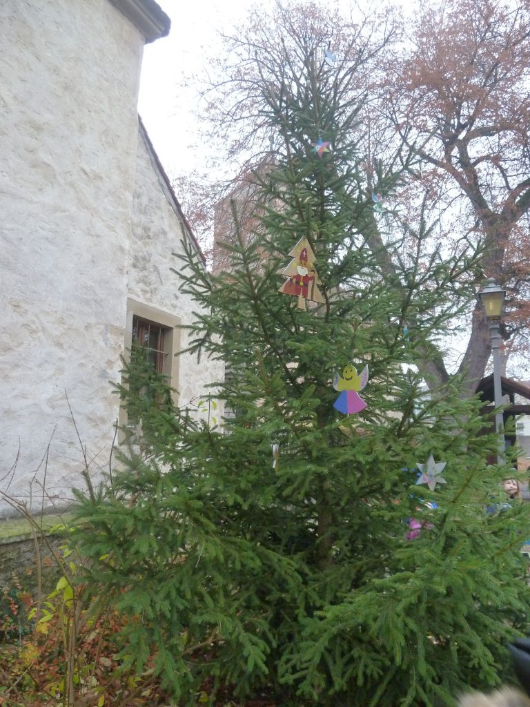 Jährlich stellt die Stadt Ochsenfurt einen Christbaum in der Dorfmitte vor der Simultankirche auf. Bis auf die Lichterkette war dieser in den vergangenen Jahren schmucklos. Dies fiel den Mitgliedern des Arbeitskreises „Erlach erleben“ auf, als Sie darüber nachdachten, wie Erlachs Dorfmitte für Jung und Alt attraktiver werden könnte. So machten sich Eltern um Bianca Scherer mit ihren Kindern auf, um das ganze Jahr über eine Dekoration für den Baum zu basteln. Bernhard Michel half beim Aussägen der Rohlinge, die über 43 Kinder aus 19 Familien anschließend liebevoll anmalten: bunte Sterne, Weihnachtsbäume mit Nikolaus und strahlende Engel entstanden. Kaum hatte der Bauhof am Montagmorgen den Baum aufgestellt, wurde er am Nachmittag schon mit vielen helfenden Händen geschmückt. Stadtrat Tilo Hemmert dankte allen, die an der Aktion beteiligt waren, insbesondere dem Bürger- und Gartenbauverein Erlach, der die Materialkosten übernommen hat.
