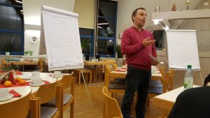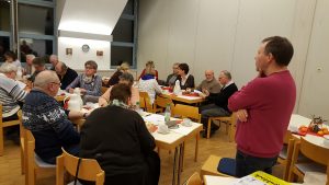 Damit die Anwesenden über ihre Glaubenserfahrungen und -wege leichter ins Gespräch kamen, hatten Schuster und Göb ein Spiel vorbereitet. Auch wenn mancher diesem zunächst skeptisch gegenüberstand, ergaben sich so an den Tischen sehr intensive, interessante Gespräche. Für die Zukunft wünschten sich viele eine stärkere ökumenische Zusammenarbeit, um das Glaubens- und Dorfleben aktiv zu halten. Ein Fazit nach den intensiven Gesprächen an den Tischen bestand in dem Wunsch, dass es neben den Gottesdienstfeiern in unseren Kirchengemeinden vermehrt Möglichkeiten zum Austausch und zur Begegnung geben sollte.