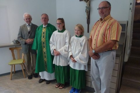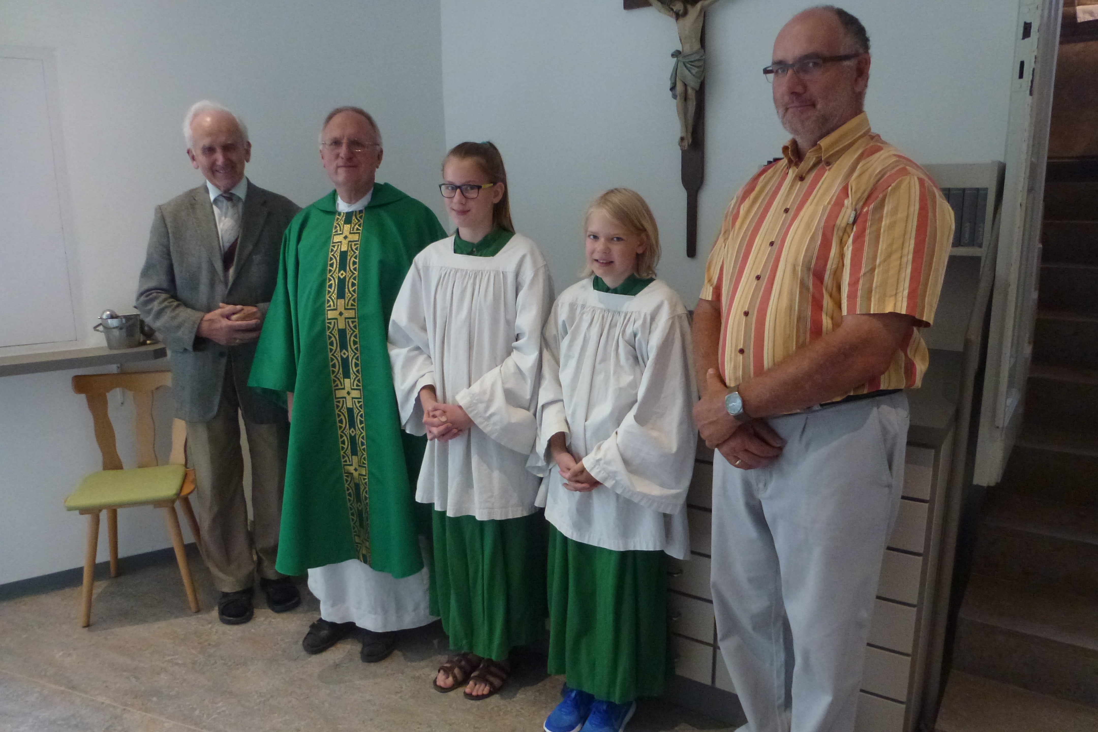Mesner Georg Koch, die Ministrantinnen Sophie Wirth und Felicia Hemmert, Pfarrer Franz Schmitt und Thomas Koch freuen sich über die Segnung der sanierten Sakristei in Erlach.