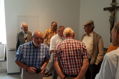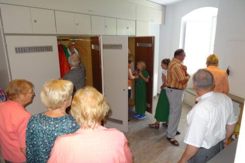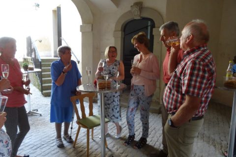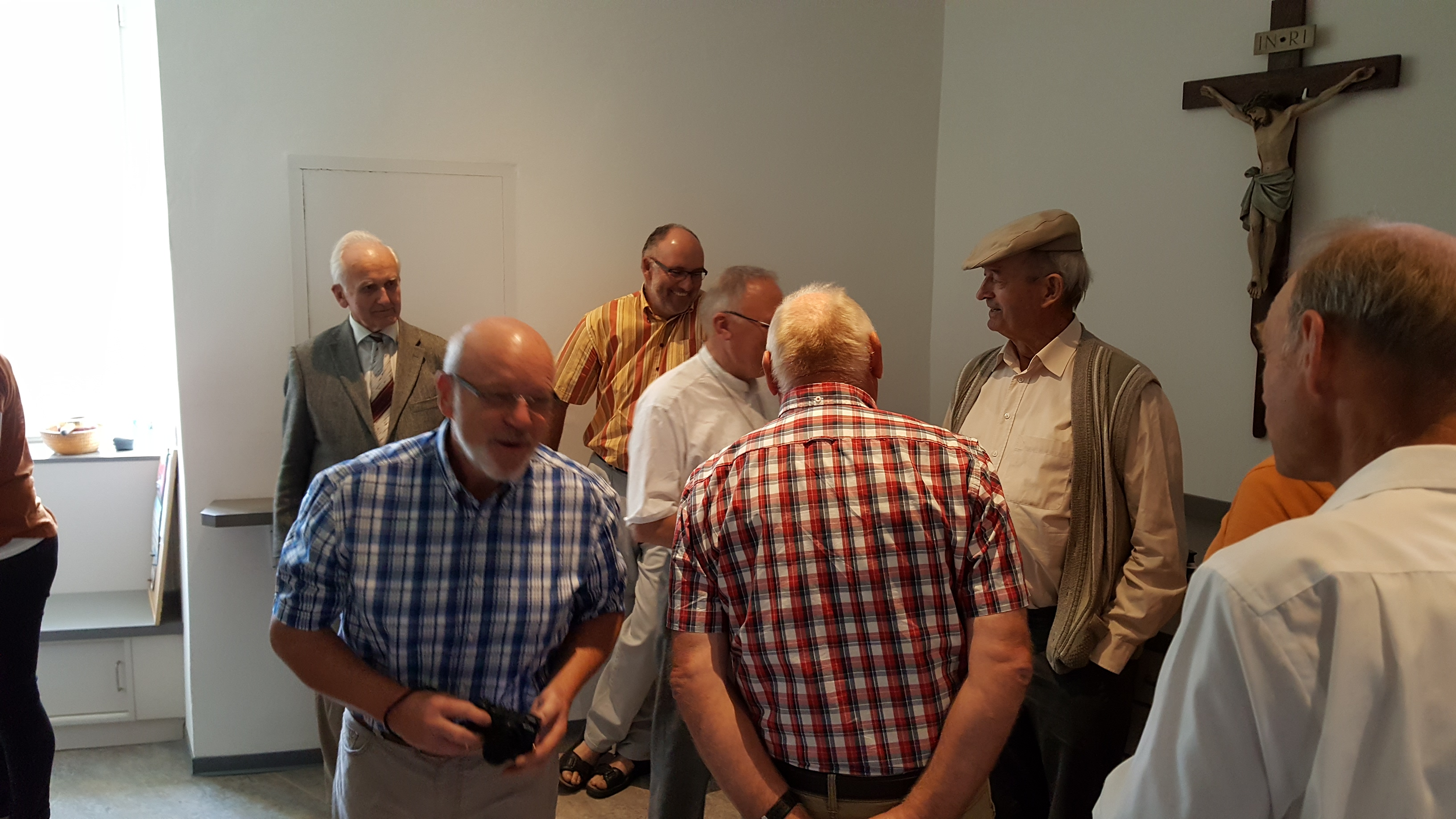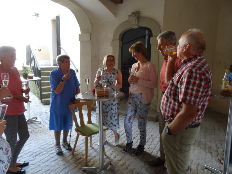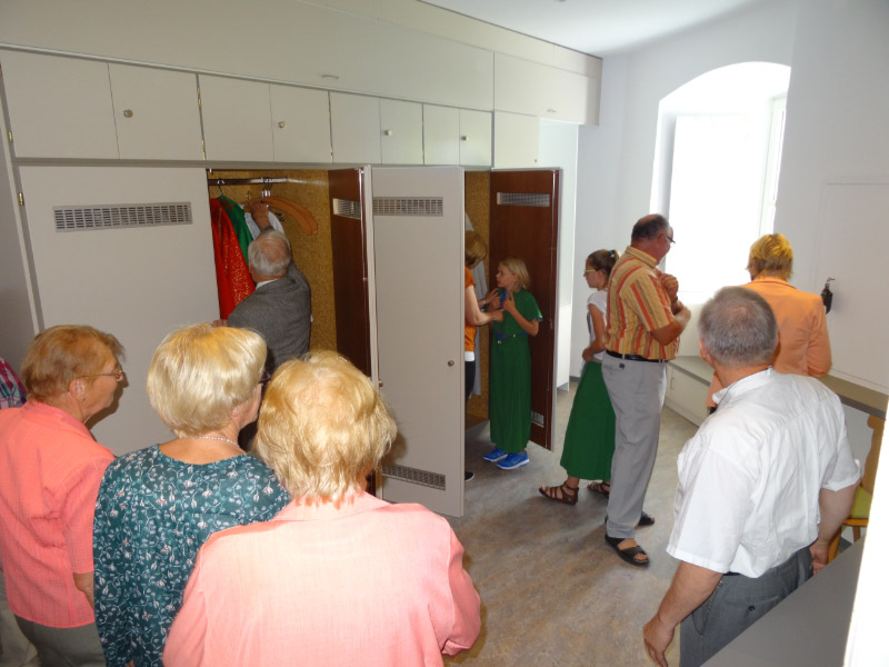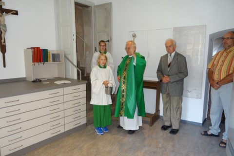 Erlach. Seit Ostern lief Sanierung der Sakristei der Schlosskapelle Erlach. Pfarrer Franz Schmitt freute sich Ende Juli 2017 über den Abschluss der Arbeiten und segnete nach dem Sonntagsgottesdienst den neu gestalteten Raum.