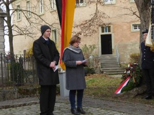Ortssprecher Tilo Hemmert (rechts) und 2. Bürgermeisterin Rosa Behon erinnerten am Volkstrauertag daran, dass auch heute noch in vielen Ländern der Welt Kriege geführt werden und dass Demokratie und Freiheit keine Selbstverständlichkeit sind.
